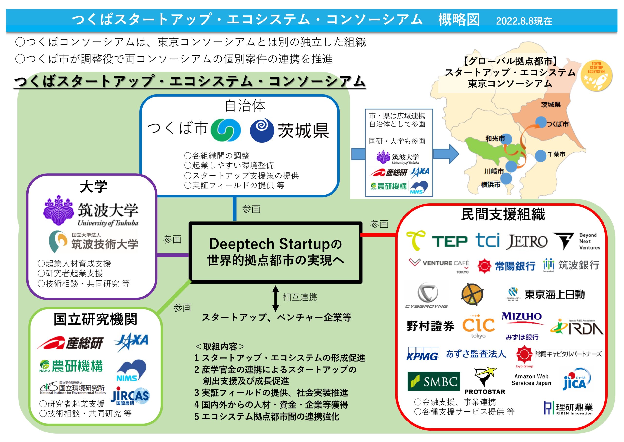 ディープテック・スタートアップの世界的拠点都市の実現を目指します!つくば市、茨城県、大学、研究機関、民間企業等が協力して、つくばを中心としたスタートアップ・エコシステムを形成するため、「つくばスタートアップ・エコシステム・コンソーシアム」を設立しました。ディープテック・スタートアップの世界的拠点都市の実現に向けて活動を行っていきます。